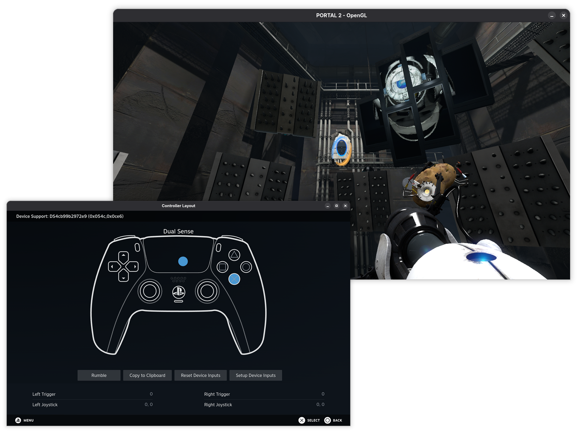 An example gaming setup, displaying Portal 2 and Steam's controller configurator. Ultramarine supports the majority of games on Steam and most game controllers.